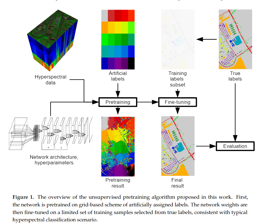 在这种情况下,我们建议用一个使用人工标签的预训练步骤来增强训练,这是独立于训练标签的。这一预训练步骤的加入可以看作是迁移学习方法的一种改进。在这种情况下,传统的迁移学习将使用具有大量标签的相关数据集(源域)进行预训练,然后使用当前数据集(目标域)进行微调。在我们的例子中,源域由高光谱图像中的每个点组成,而目标域仅由标记的样本组成。