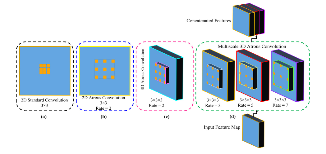 空洞卷积运算。图2(c)显示了 3D 空洞卷积运算,最后,图2(d)示出了多尺度 3D