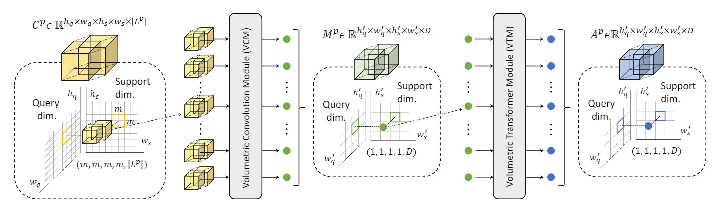 语义分割是一项基本的计算机视觉任务,旨在用其相应的类别来标记图像中的每个像素。在深度神经网络和包含真实地物分割标注的大规模数据集的帮助下,这个方向已经取得了实质性进展 [37,46,3,4,61]。然而,手动标记按像素级划分的图需要大量的工作,因此很难添加新的类别。为了减少对标记数据的依赖,人们越来越关注小样本分割 [49, 55],其中仅使用少量支持图像及其相关的掩膜来预测查询图像的分割。 小样本分割的关键是有效利用少量支持样本。许多工作尝试通过从样本中提取原型模型并将其用于与查询进行特征比较 [58,10,35,78]。然而,此类方法忽略了支持和查询特征之间的像素级成对关系或特征的空间结构,这可能导致次优结果。 为了解释这种关系,我们观察到小样本分割可以重新表述为语义对应,其目的是在语义相似的图像之间找到像素级对应,这些图像可能包含大量的类内外观和几何变化 [13,14,43]。最近的语义对应模型 [50,25,51,53,42,44,34,65,41] 遵循特征提取、代价聚合和流量估计的经典匹配流程 [54,47]。在代价聚合阶段,对匹配分数进行细化以产生更可靠的对应估计,这一阶段尤为重要,也是许多研究的重点 [53,42,52,22,34,29,41,6]。最近,CATs [6] 提出使用 Vision Transformer [11] 进行代价聚合,但其对输入标记数量的二次复杂度限制了其适用性。它还忽略了匹配成本的空间结构,这可能会损害其性能。 在小样本分割领域,也存在尝试通过交叉注意力 [83] 或图注意力 [81,68,75] 利用成对信息来优化特征的方法。然而,他们仅依赖于原始相关图,而不聚合匹配分数。因此,他们的对应关系可能会因重复模式或背景混乱而产生歧义 [50,25,27,65,17]。为了解决这个问题,HSNet [40] 使用 4D 卷积聚合匹配分数,但其有限的感受野限制了远程上下文的聚合,并且由于使用固定内核,它缺乏适应输入内容的能力。 在本文中,我们介绍了一种新颖的代价聚合网络,体积聚合 Transformer(VAT),它通过提出的 4D 卷积 Swin Transformer 来解决小样本分割任务。具体来说,我们首先扩展 Swin Transformer [36] 及其补丁嵌入模块来处理高维相关图。通过引入 4D 卷积,进一步扩展了补丁嵌入模块,缓解了补丁嵌入带来的问题,即补丁边界附近有限的局部上下文和低归纳偏差。高维补丁嵌入模块被设计为一系列重叠的小核卷积,为每个像素带来局部上下文信息,并赋予卷积归纳偏差。为了进一步提高性能,我们采用金字塔结构来构建我们的架构,该结构将较粗级别的聚合相关图作为更精细级别的附加输入,从而提供分层指导。然后,我们的亲和力感知解码器以利用查询的外观嵌入给出的更高分辨率空间结构的方式对聚合匹配分数进行细化,并最终输出分割掩膜预测。 我们在几个基准测试中证明了我们的方法的有效性 [55,31,30]。我们的工作在小样本分割甚至语义对应的所有基准上都达到了最先进的性能,突出了代价聚合对于这两项任务的重要性,并显示了其在一般匹配方面的潜力。我们还进行了消融研究来证明我们的设计选择的合理性。