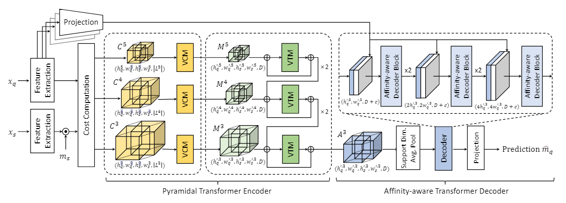 小样本分割的关键是如何有效地利用为查询图像提供的支持样本。传统方法 [63,60,83,79,28] 利用从支持特征中提取的全局或部分级原型,而最近的方法 [81,68,40,75,32,83] 则利用查询图像和支持图像之间的成对匹配关系。然而,由于类内变化、背景混乱和重复模式,探索这种关系非常具有挑战性。最先进的方法之一是 HSNet [40],它通过 4D 卷积聚合匹配分数。然而,由于感受野有限或卷积核缺乏适应性,单独使用卷积可能会限制性能。虽然还没有方法可以在小样本分割中使用 Transformer 聚合匹配分数,但 CATs [6] 提出了在语义对应中使用 Transformer 进行代价聚合,证明了 Transformer 作为代价聚合器的有效性。另一方面, Transformer 相对于标记数量的二次复杂度可能会限制其在分割中的实用性。缺乏赋予归纳偏差(例如平移等变性)的操作也可能限制其性能。此外,CATs [6] 定义相关图的标记方式忽略了空间结构,这可能会有害。 提出的代价聚合 Transformer (VAT) 旨在克服这些问题。下面,我们首先描述其特征提取和代价计算。然后,我们提出了 Swin Transformer [36] 用于代价聚合的通用扩展。随后,我们提出了 4D 卷积 Swin Transformer 来解决上述问题。最后,我们介绍了几种额外的技术,包括引导金字塔处理(GPP)和亲和感知 Transformer 解码器(ATD),以进一步提高性能,并将它们结合起来完成设计。