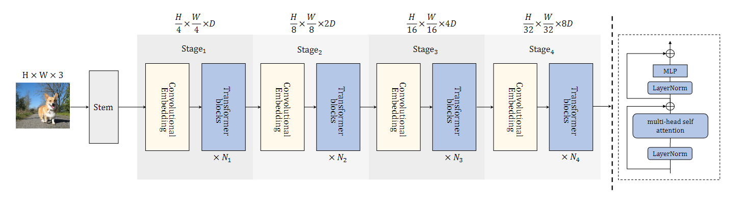 所示。将卷积干应用于输入图像以提取低级特征,然后通常经过四个阶段来逐渐提取不同尺度的深度表示。