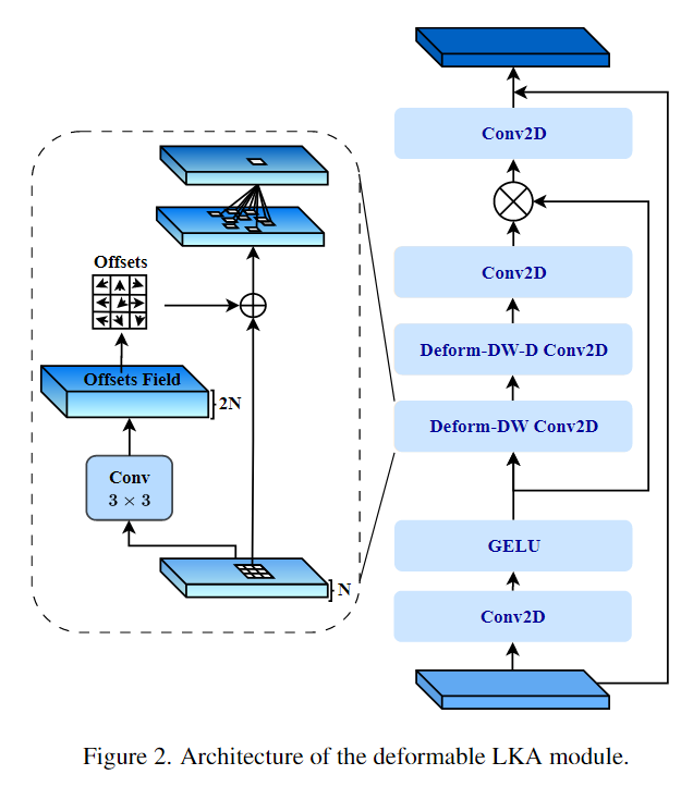 2D D-LKA 块的结构包括 LayerNorm、可变形 LKA 和多层感知器